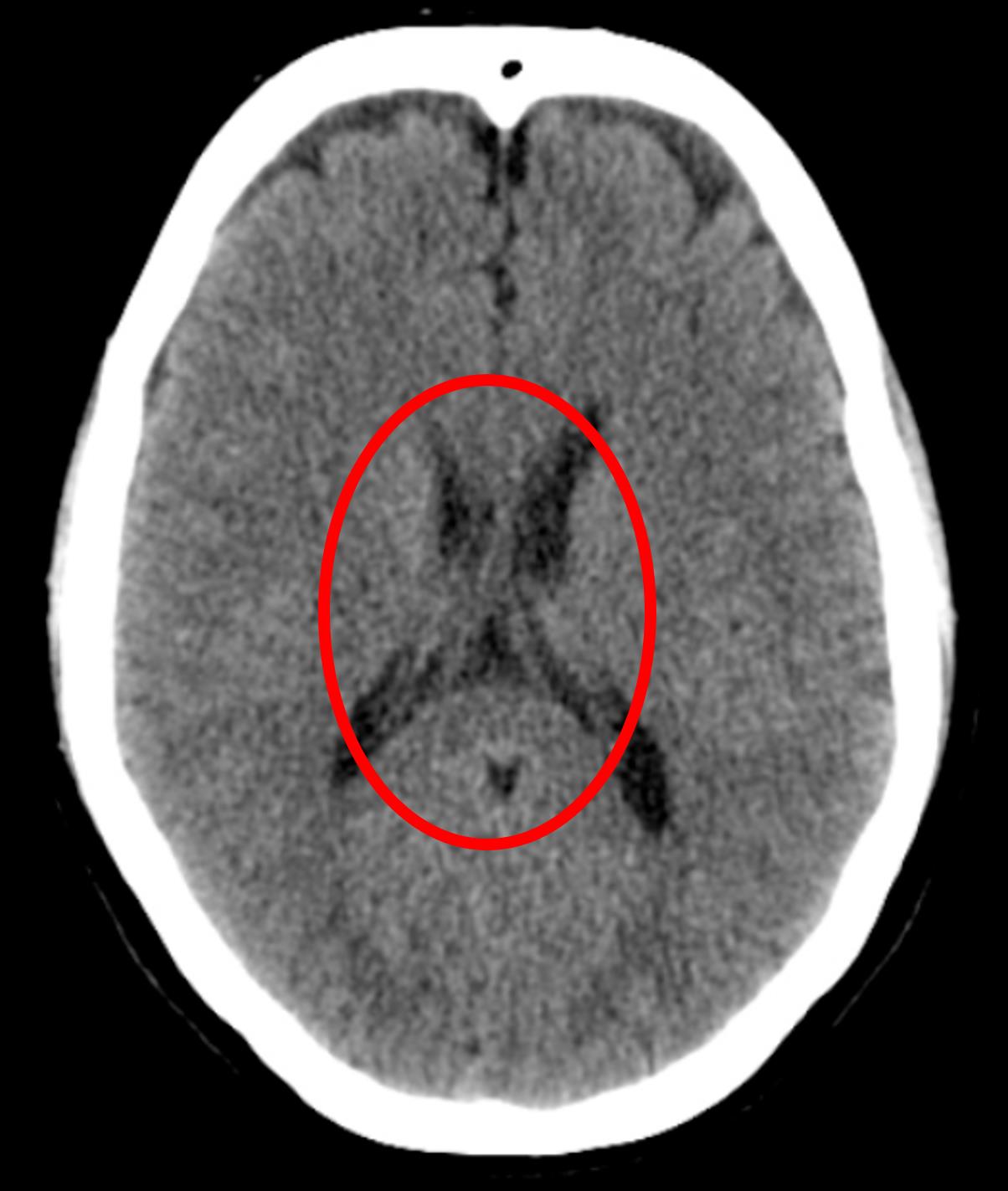 This patient is presenting with hyponatremia after sustaining a concussion. This is consistent with the syndrome of inappropriate antidiuretic hormone (SIADH) and should be treated initially with fluid restriction.SIADH can occur after many different pathologies, including neurological disease, neurological injury, pulmonary disease, drug interaction, or malignancy. These mechanisms trigger the release of antidiuretic hormone that results in excessive water absorption. Most patients are typically asymptomatic in mild or moderate cases; however, patients who have severe hyponatremia can present with anorexia, nausea, malaise, headache, muscle cramps, confusion, weakness, seizures, or coma. Hyponatremia detected on laboratory studies is the typical finding that suggests the diagnosis. Patients with SIADH will be refractory to fluid boluses or worsen with this intervention. The most appropriate initial step in management for asymptomatic SIADH is fluid restriction. Salt tabs or conivaptan can be used in recalcitrant cases.Grant et al. review the evidence regarding the diagnosis and treatment of hyponatremia as an inpatient. They discuss how SIADH can be a cause of hyponatremia. They recommend evaluating the volume status of the patient in these cases.Figure/Illustration A is a head CT demonstrating normal brain morphology with patent ventricles (red circle). This finding is consistent with SIADH due to a concussion.Incorrect Answers:Answer 1: Conivaptan is an ADH receptor antagonist that could be indicated in refractory/severe cases of SIADH that do not respond to other therapies, including fluid restriction and salt tablets.Answer 2: Demeclocycline and lithium can induce a nephrogenic diabetes insipidus; however, their use is not routinely recommended (not first-line). These medications may only be used in cases that are severe and resistant to other interventions.Answer 4: Increasing fluid boluses would not be appropriate as this patient's SIADH-induced hyponatremia should be addressed with fluid restriction. Fluid boluses may be useful in patients who have hyponatremia due to volume depletion.Answer 5: Oral salt tablets are an appropriate treatment for SIADH; however, they are second-line to fluid restriction in asymptomatic cases. Fluid restriction will decrease the inappropriate retention of fluid, whereas salt tabs will expand the intravascular volume.Bullet Summary:SIADH presents with hyponatremia, and the most appropriate initial step in management is fluid-restriction followed by salt tablets.