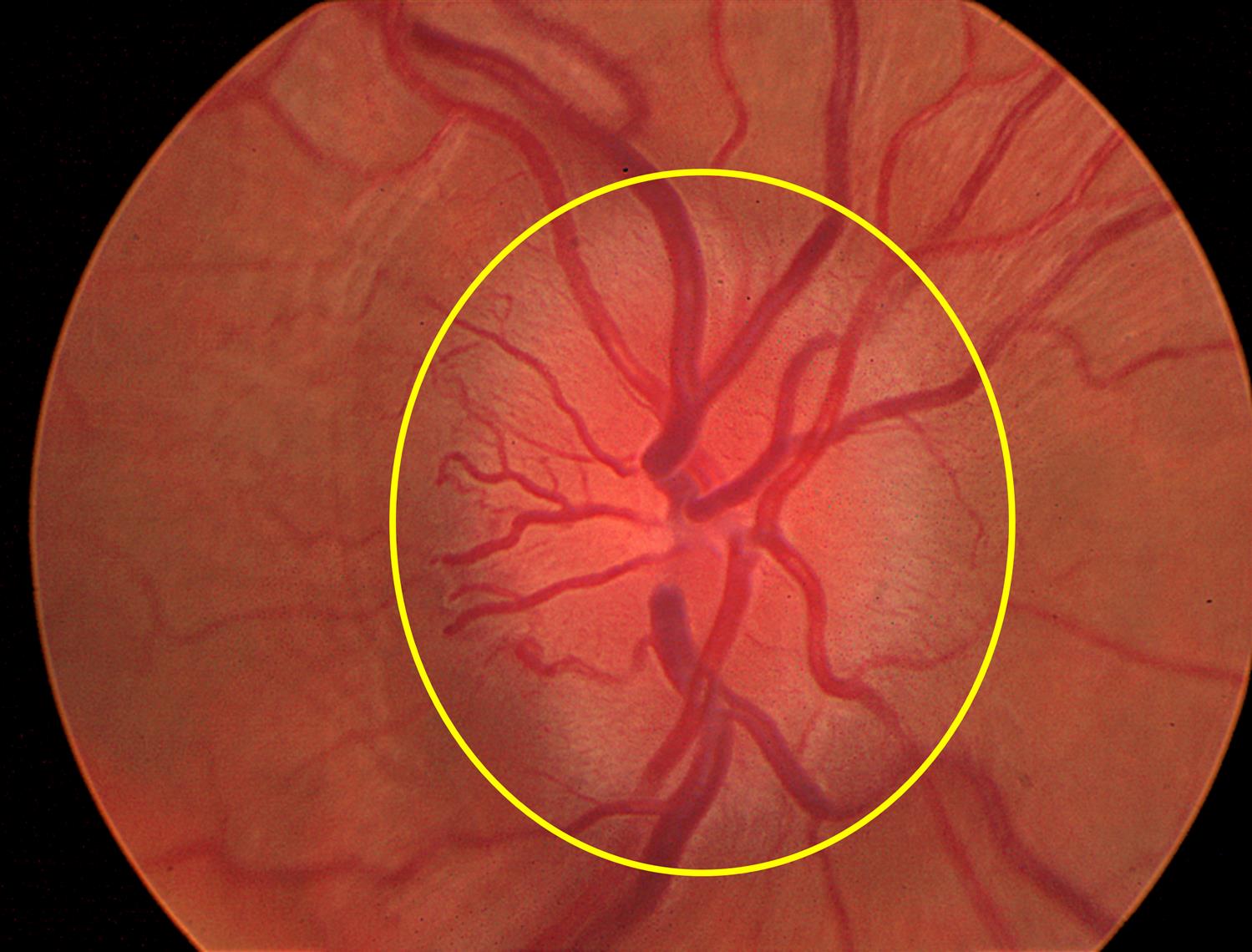 This patient with severe acne most likely started isotretinoin and is now presenting with papilledema, headache, blurry vision, and diplopia. These symptoms are consistent with a diagnosis of idiopathic intracranial hypertension.Idiopathic intracranial hypertension is characterized by an increase in intracranial pressure without an identifiable cause. Risk factors include obesity as well as medications such as isotretinoin or oral contraceptive pills. Patients often present with symptoms that include headache, blurry vision, and tinnitus. Fundoscopic examination typically reveals bilateral papilledema. If left untreated, a complication of this condition is vision loss. Management should first involve imaging of the brain to exclude elevated cerebrospinal fluid pressure due to other causes such as a brain tumor, dural sinus thrombosis, or hydrocephalus. The diagnosis is made via lumbar puncture, revealing increased opening pressure. Lumbar puncture can also result in therapeutic relief. The specimen should be sent for Gram stain, culture, and viral PCR to rule out other etiologies. Long-term treatment is centered on weight loss and avoiding causative agents. Acetazolamide and serial lumbar punctures are other treatments.Boyter reviews the evidence regarding the clinical presentation and management of patients with idiopathic intracranial hypertension. They found that the condition is most common among obese women in their 20s. They recommend referral for patients to see a neurologist for ongoing management of headaches, as well as an ophthalmologist for monitoring of papilledema. Figure/Illustration A is a funduscopic exam that demonstrates blurring of the optic disc margin (yellow circle). This finding is consistent with increased intracranial pressure.Incorrect Answers: Answer 1: Cerebrovascular accidents can be embolic or hemorrhagic in nature and often result in persistent neurologic deficits in a patient with cerebrovascular risk factors such as diabetes, hypertension, or hyperlipidemia. This young, healthy patient with intermittent headache and neurologic symptoms without a family history of hypercoagulable state is unlikely to have suffered from a cerebrovascular accident. Answer 2: Giant cell arteritis (GCA) is a vasculitis that is typically seen in elderly patients and presents with tenderness of the ipsilateral temple and elevated inflammatory markers. Many patients with GCA also have constitutional symptoms such as weight loss, fever, fatigue, anorexia, and malaise in addition to symptoms such as new-onset headache or jaw claudication.Answer 4: Meniere disease affects the inner ear and is characterized by severe episodes of vertigo, tinnitus, hearing loss, and fullness in the ear. Patients are often women between the ages of 40 and 60. Headaches and blurry vision are not a classic part of the clinical presentation.Answer 5: Migraines can be incapacitating, with associated photophobia and phonophobia. In some cases, patients may present with an aura that precedes or occurs during the migraine. The presence of papilledema suggests elevated intracranial pressure and is not typically seen in migraines.Bullet Summary:Idiopathic intracranial hypertension may be a side effect of isotretinoin.