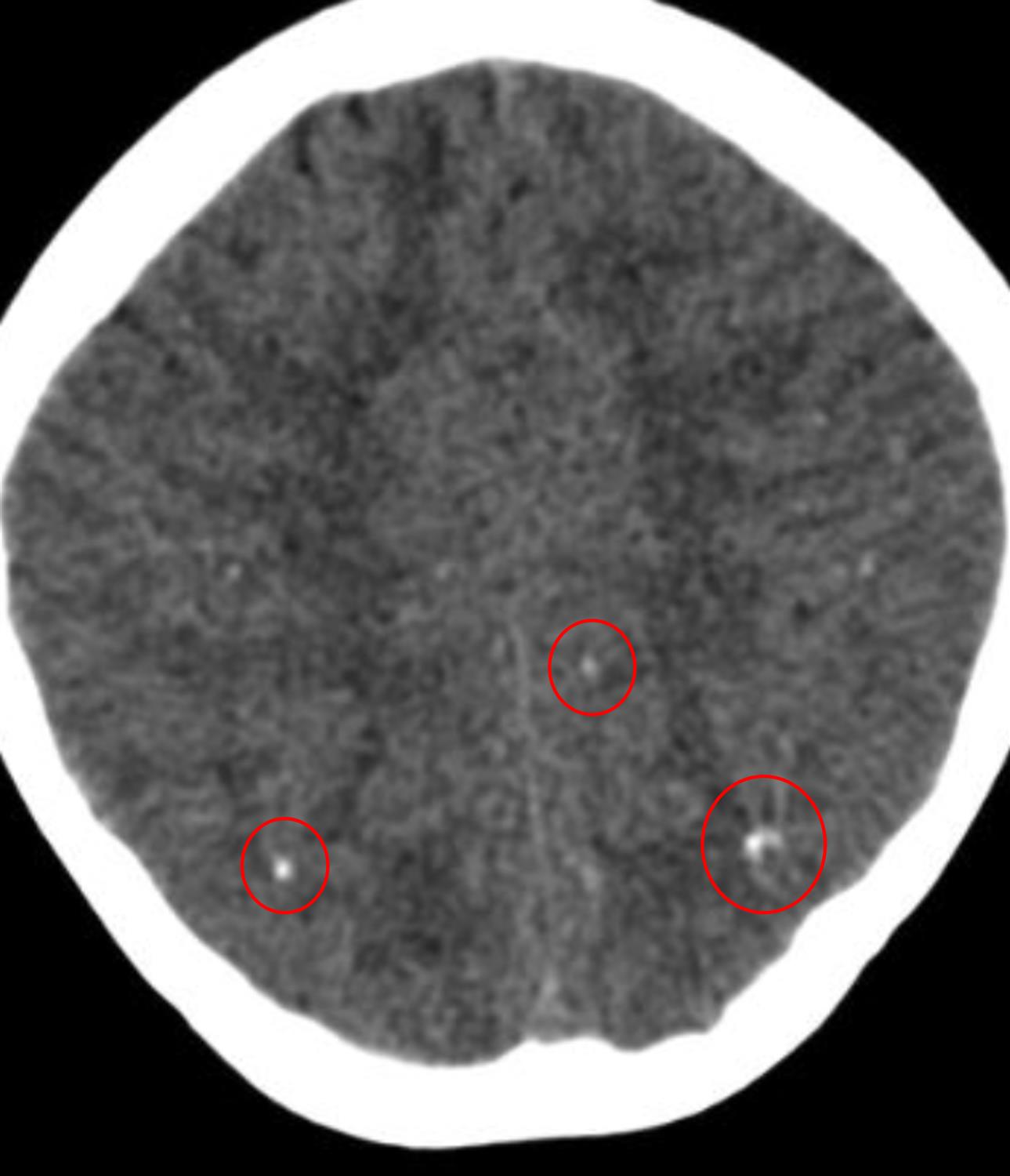 This infant, who presents with a purpuric rash, chorioretinitis, signs of hydrocephalus, and diffuse intracranial calcifications on imaging, most likely has congenital toxoplasmosis infection. Maternal toxoplasmosis is usually asymptomatic but may present with generalized symptoms such as low-grade fever and lymphadenopathy. Primary transplacental transmission occurs when the mother is infected, usually after the first trimester. Risk factors for toxoplasmosis, a classic "TORCH" infection, include consumption of undercooked meat, ingestion of contaminated cat feces, or consumption of unpasteurized goat’s milk. Infants with congenital toxoplasmosis classically present with the triad of chorioretinitis, intracranial calcifications, and hydrocephalus. Signs of hydrocephalus include lethargy, vomiting, seizures, enlarged head circumference, and ventriculomegaly. Jaundice, sensorineural hearing loss, low birth weight, hepatosplenomegaly, and a “blueberry muffin rash” may also be seen. Treatment includes pyrimethamine and sulfadiazine, along with folinic acid to prevent bone marrow suppression. Fortin et al. review the evidence regarding outcomes in children born with congenital or perinatal infections. They discuss how, even in the absence of symptoms at birth, children exposed to many infections in utero may be at greater risk for developing neurodevelopmental disorders in childhood. They recommend that congenital infections should be considered in the differential diagnosis of a child with neurodevelopmental challenges.Figure/Illustration A is a head CT demonstrating diffuse calcifications inside the brain parenchyma (red circles). These findings are consistent with congenital toxoplasmosis infection.Incorrect Answers:Answer 1: Congenital cytomegalovirus infection would similarly present with seizures, sensorineural deafness, jaundice, chorioretinitis, a purpuric rash, and low birth weight; however, imaging classically shows periventricular calcifications and microcephaly.Answer 2: Congenital rubella infection would also present with low birth weight, a purpuric rash, chorioretinitis, and hydrocephalus; however, other key distinguishing features of congenital rubella infection are lacking, such as cardiac defects and cataracts. Additionally, this infant’s mother is up-to-date on immunizations, making an intrauterine rubella infection unlikely.Answer 3: Congenital syphilis infection may present similarly with premature delivery, low birth weight, jaundice, seizures, and chorioretinitis; however, this patient lacks other characteristic findings of congenital syphilis such as facial abnormalities, including saddle nose and notched teeth, and skeletal deformities such as saber shins.Answer 5: Congenital varicella infection may also present with low birth weight, chorioretinitis, and seizures, but is less likely in this infant born to a mother with up-to-date immunizations.Bullet Summary:Congenital toxoplasmosis presents with the triad of chorioretinitis, hydrocephalus, and intracranial calcifications along with sensorineural deafness, jaundice, and a “blueberry muffin rash.”
