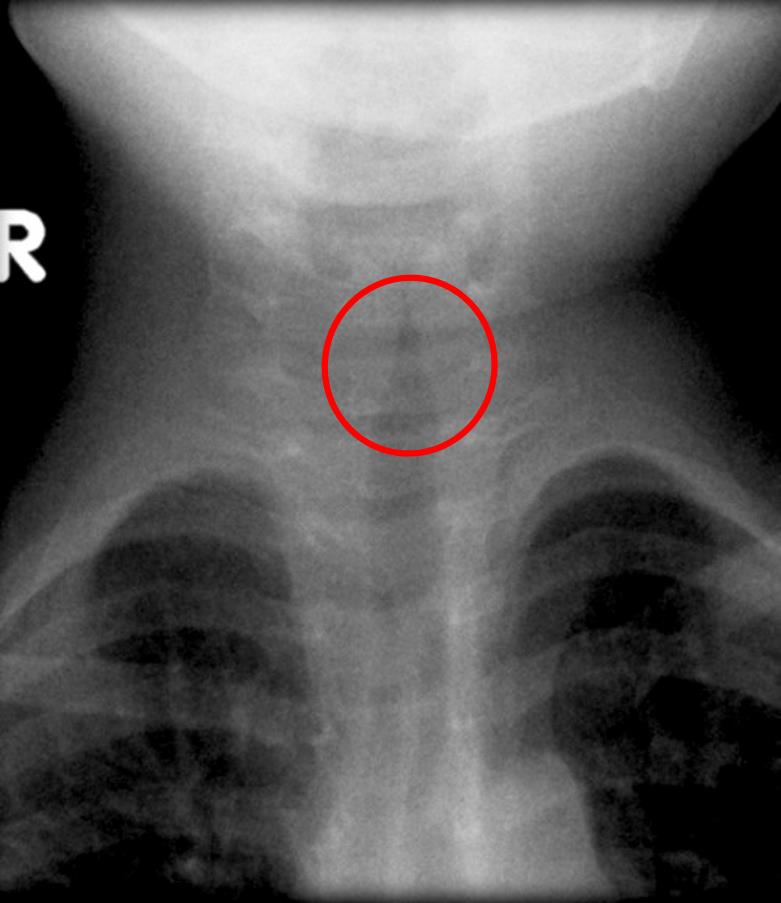 This patient with a fever, high-pitched cough, inspiratory stridor, respiratory distress, and a chest radiograph demonstrating subglottic narrowing, most likely has croup. Patients with severe croup should be treated with corticosteroids and nebulized epinephrine.Croup is caused by the parainfluenza virus and results in inflammation of the upper airways. It typically presents with a high-pitched "seal-like” cough and inspiratory stridor that worsens at night. Mild to moderate cases can result in subcostal retractions and nasal flaring with exertion. The diagnosis is primarily clinical. Cool mist and corticosteroids are the preferred treatment. Severe cases are characterized by stridor at rest and should be treated with corticosteroids and nebulized epinephrine to relieve the upper airway obstruction. Epinephrine is preferred over albuterol because this medication has alpha-1 activity that reduces edema via vasoconstriction.Gates et al. studied the use of glucocorticoids in children with croup. They found that glucocorticoids were associated with reduced symptoms within 2 hours and shortened hospital stays. They recommend that glucocorticoids be used in this patient population.Figure/Illustration A is a chest radiograph highlighting subglottic narrowing, also known as the “steeple sign” (red circle). This finding is classically seen in patients with croup.Incorrect Answers:Answer 1: Bronchoscopy would be performed if foreign body aspiration were suspected which can also present with cough, respiratory distress, and stridor; however, it presents more acutely and would not be accompanied by fever and rhinorrhea as seen in this infant.Answer 2: Cool mist and corticosteroids would be the treatment of choice for mild to moderate croup. This patient presents with severe croup as he has inspiratory stridor and respiratory distress at rest. Answer 4: Intubation is the treatment of choice for rapidly deteriorating respiratory distress, such as in a patient with epiglottitis. Although this patient demonstrates respiratory distress at rest, he is not hypoxemic nor has vital sign changes (tachycardia, bradycardia, and hypotension) that would suggest an imminent threat of respiratory compromise. Answer 5: Nebulized albuterol is a short-acting beta-2 agonist commonly used for the treatment of asthma or bronchospasm. Asthma may also present with respiratory distress and decreased breath sounds. However, low-pitched wheezing is characteristic, not inspiratory stridor. Nebulized albuterol is not a common treatment for croup as it lacks the alpha-1 activity essential for reducing upper airway edema.Bullet Summary:Severe croup presents with inspiratory stridor at rest, a barking cough, and respiratory distress and should be treated with corticosteroids and nebulized epinephrine.