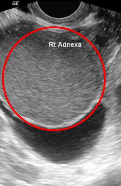 This patient with dyspareunia, chronic pelvic pain, and dyschezia, most likely has endometriosis. The presence of a mass on the ovary is consistent with an endometrioma.Endometriosis is thought to occur due to ectopic implantation of the endometrial tissue from retrograde menstruation. It can present with a wide array of symptoms depending on the location of the implanted tissue. Dyspareunia can be caused by ectopic implants surrounding the vagina, while dysuria can be caused by implants on the bladder or that compress the ureter. Dyschezia is usually caused by endometriosis involving the rectovaginal space. An implant on the ovary, known as an endometrioma, may be the only presenting finding of endometriosis. Patients with endometriosis are at increased risk of future infertility. Conservative treatment includes oral contraceptives and non-steroidal anti-inflammatory medications, while surgical excision of visible lesions can be conducted in refractory cases unresponsive to medical therapy.Nisenblat et al. review imaging modalities for the non-invasive diagnosis of endometriosis. They found that transvaginal ultrasonography has a sensitivity of 93% and specificity of 96%. They recommend the use of either MRI or ultrasound in the diagnostic evaluation of patients with suspected endometriosis. Figure/Illustration A is an ultrasound of the ovary demonstrating a homogenous mass (red circle). This appearance is consistent with a diagnosis of an endometrioma.Incorrect Answers: Answer 1: Adenomyosis is the presence of endometrial tissue within the myometrium of the uterus and can also present with pelvic pain. Adenomyosis tends to cause heavy menstrual bleeding, which is absent in this patient. Adenomyosis would not explain the ultrasound findings of a mass on the ovary. Adenomyosis is heavily correlated with endometriosis.Answer 3: Leiomyomas, also known as fibroids, can present with chronic pelvic pain and pelvic pressure that is worsened with activity and vaginal bleeding. These benign tumors arise from the smooth muscle cells of the uterine myometrium and not the ovary.Answer 4: Mature teratoma can cause pelvic pain, but ultrasound findings typically reveal calcified, heterogenous nodules. This patient has a homogenous nodule on her ovary that is more consistent with an endometrioma. Answer 5: Pelvic inflammatory disease can present with pelvic pain in a patient with a history of an inadequately treated sexually transmitted infection. This disease would likely have bilateral involvement of the ovaries and no cystic findings on ultrasound.Bullet Summary: Endometriosis can present with dyspareunia, dyschezia, and dysuria.