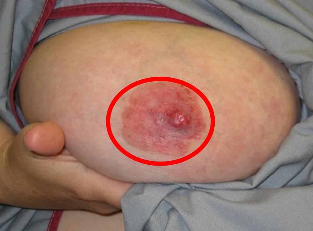 This patient with erythematous and pruritic nipple and areolar changes unresponsive to corticosteroids most likely has Paget disease of the breast. This condition is associated with underlying adenocarcinoma.Paget disease of the breast is a chronic, eczematous rash of the nipple and areola. The skin changes seen with this condition are thought to be the result of malignant cell migration through the mammary ducts to the nipple surface. An underlying adenocarcinoma, most often ductal carcinoma in situ, is present in nearly 100% of cases. Patients will present with an erythematous, eczematous, potentially ulcerating rash along with pain, burning, itching, or bleeding. These lesions typically have no response to topical corticosteroids. Further workup includes mammography to locate an underlying malignancy, scrape cytology to detect malignant Paget cells, and biopsy of the lesion. Treatment of Paget disease of the breast depends on the treatment of the underlying breast cancer.Schelfhout et al. reviewed the role of the HER2/NEU receptor in the spread of Paget cells through the nipple epidermis. They found that Paget cells express heregulin receptors as well as HER2/NEU receptors. They recommend further study of the role of chemotactic factors released by breast keratinocytes in the migration of malignant cells in Paget disease of the breast.Figure/Illustration A is a clinical photograph showing eczematous changes of the nipple and areolar region (red circle). These changes are classically seen with Paget disease of the breast.Incorrect Answers:Answer 2: Inflammatory breast cancer is often a type of invasive ductal carcinoma. The malignant cells obstruct the lymphatic vessels, causing the characteristic inflammatory appearance. It will present as breast redness and pain with peau d’orange changes in the skin.Answer 3: Intraductal papilloma is a benign epithelial tumor located in the lactiferous ducts of the breast. It will usually present as painless bloody nipple discharge in a woman under 50.Answer 4: Phyllodes tumor is a rare, benign tumor known to have a leaf-like appearance on biopsy. The typical presentation is a breast mass that is rapidly growing, firm, mobile, and nontender.Answer 5: Squamous cell carcinoma in situ (Bowen disease), in extremely rare cases, can present on the nipple as an erythematous lesion with hyperkeratosis, desquamation, and pruritus. A small percentage of patients will progress to invasive squamous cell carcinoma.Bullet Summary:Paget disease of the breast is associated with underlying adenocarcinoma.