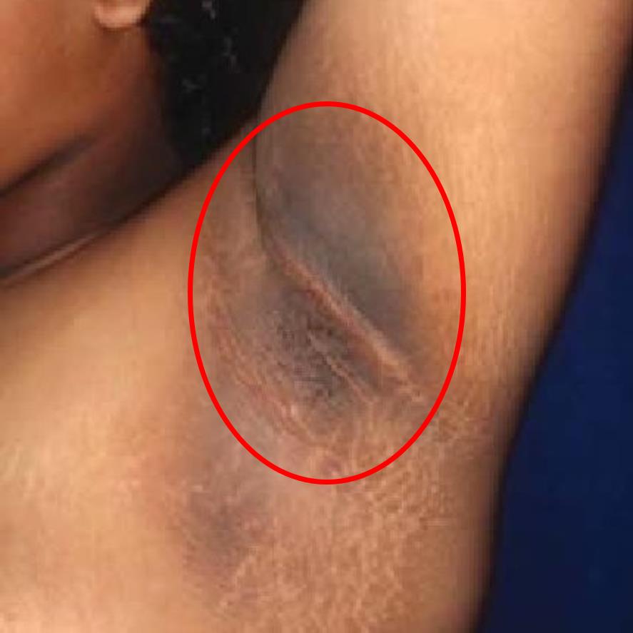 This patient with hyperpigmented skin in the setting of diabetes most likely has acanthosis nigricans secondary to insulin resistance. A commonly associated skin finding in patients with diabetes mellitus is acrochordons, which are soft, benign, often pedunculated skin tags.Acanthosis nigricans manifests as brown-black velvety hyperpigmentation of the skin, typically arising in intertriginous areas of the body. It is caused by the activation of growth factor protein receptors, most commonly insulin-mediated activation of insulin-like growth factor receptors in keratinocytes in the setting of hyperinsulinemia or insulin resistance. In certain cases, it is a paraneoplastic sign of adenocarcinoma, typically of the gastrointestinal tract. Acanthosis nigricans is also associated with acrochordons, which are benign common skin neoplasms and also referred to as skin tags, fibroepithelial polyps, or papillomas. Treatment involves treatment of the underlying disease such as with weight loss, metformin, discontinuing offending drugs, and topical retinoids.Novotny et al. review the epidemiology of obesity, type 2 diabetes, and acanthoma nigricans in Pacific Islanders. They discuss how environmental interventions, such as encouraging less consumption of sugar-sweetened beverages, decreased the prevalence of acanthosis nigricans. They recommend the continued study of these interventions among children in the Pacific region.Figure/Illustration A is a clinical photograph demonstrating brown, velvety, hyperkeratotic plaques in the axilla (red circle). These findings are classically seen in patients with acanthosis nigricans.Incorrect Answers:Answer 1: Acne vulgaris is common in patients with polycystic ovary syndrome due to an elevation in testosterone. It is less associated with insulin resistance, which is the underlying pathology of acanthosis nigricans and acrochordons.Answer 3: Dermatitis herpetiformis is a skin finding associated with celiac disease that manifests as pruritic papules, vesicles, and bullae most commonly located at the elbows, knees, and buttocks. Celiac disease is not associated with acanthosis nigricans.Answer 4: Erythema nodosum manifests as painful, raised, and erythematous inflammatory lesions of the subcutaneous fat, most commonly on the anterior shins, and is associated with numerous conditions, such as inflammatory bowel disease, sarcoidosis, histoplasmosis, coccidioidomycosis, tuberculosis, streptococcal infections, and leprosy.Answer 5: Xanthomas are a skin finding associated with hyperlipidemia, which can be associated with metabolic syndrome. They are the result of lipid accumulation in cells within the skin. Lesions typically appear as yellowish, waxy-appearing raised plaques. Bullet Summary:Acanthosis nigricans and acrochordons are usually associated with insulin resistance and obesity in younger patients.