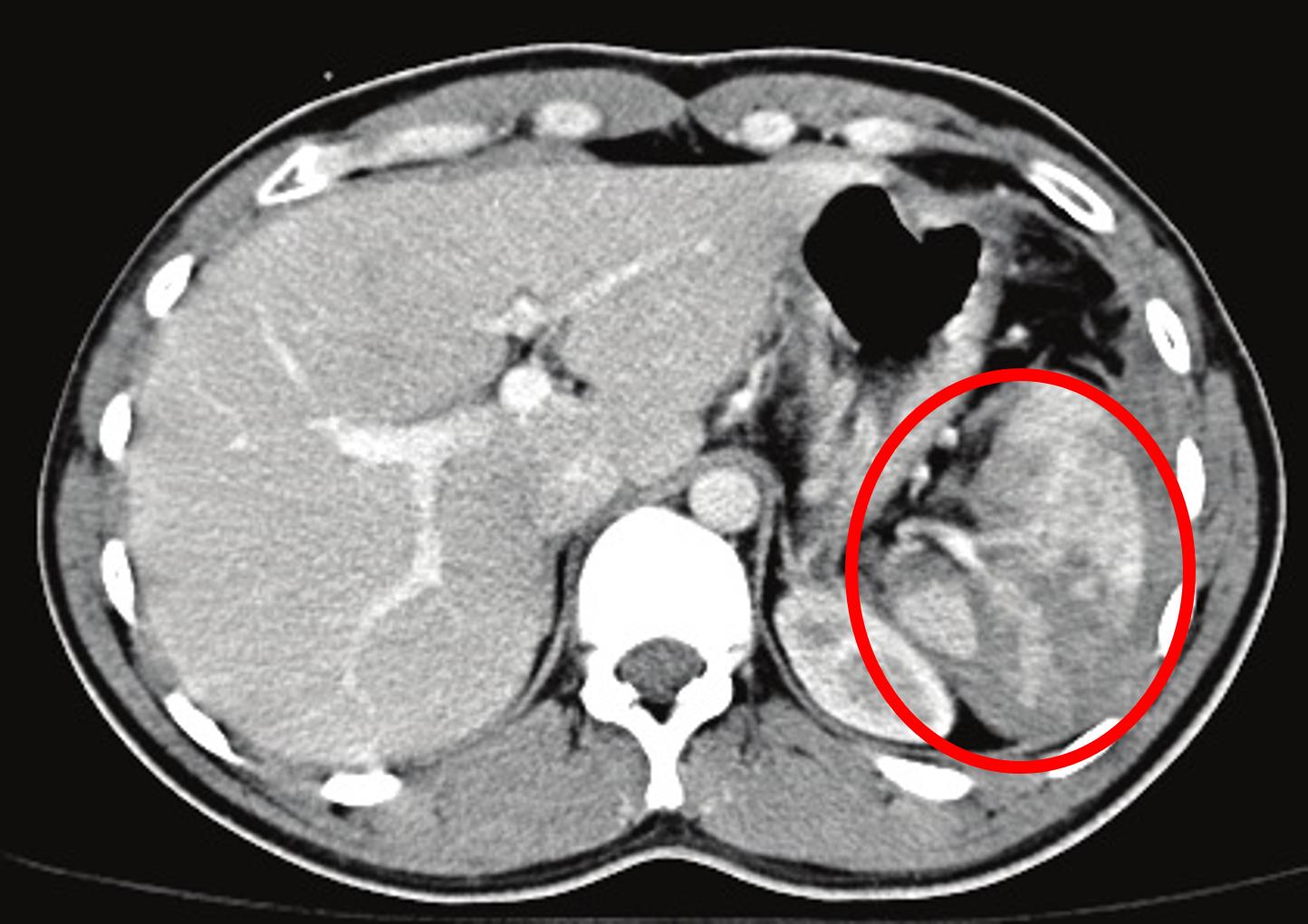 This patient with evidence of splenic rupture and hemoperitoneum on CT imaging most likely underwent emergency splenectomy. Subsequently, this asplenic patient will require vaccination against encapsulated bacteria such as S. pneumoniae, N. meningitidis, and H. influenzae.The capsules of encapsulated bacteria serve as an antiphagocytic virulence factor. To clear these bacteria, opsonization and subsequent clearance by the spleen must occur. In the setting of asplenia, opsonization capability is significantly decreased and thus asplenic patients are at high risk of severe infections by encapsulated bacteria. Asplenic patients require vaccination against the encapsulated bacteria S. pneumoniae, N. meningitidis, and H. influenza. With regards to S. pneumonia, the recommended vaccine sequence would be PCC13 first followed by PPSV23 8 weeks later. With regards to meningococcal and H. influenza type B, these vaccines would be provided either 14 days before or 14 days after the procedure to remove the spleen.Patton et al. review the recommendations for serogroup B meningococcal vaccination. They discuss how patients aged 10 to 25 years old who are at increased risk for meningococcal disease, such as asplenic patients, should get 3 doses of the MenB-FHbp vaccine. They recommend the administration of only 2 doses of the vaccine to patients who are not at elevated risk.Figure/Illustration A is an abdominal CT that demonstrates a traumatic appearance of the spleen with a perisplenic hemoperitoneum (red circle). These findings are consistent with a high grade splenic laceration.Incorrect Answers:Answer 1: Insertion of a nasogastric tube would be appropriate in a patient with bowel obstruction or significant post-operative ileus. There is no evidence that this patient is experiencing obstruction or ileus, which typically presents with nausea, vomiting, abdominal pain, bloating, and lack of flatus or bowel movements.Answer 2: Insertion of a thoracostomy tube is not indicated in this patient as there is no evidence of pneumothorax or hemothorax. Patients with pneumothorax or hemothorax typically present with tachycardia, tachypnea, and decreased oxygen saturation. On exam, such patients may have decreased breath sounds. Ultrasonography may also reveal the absence of lung sliding.Answer 3: Standing cefazolin and gentamicin are not indicated in the immediate post-operative period for asplenic adults. Daily oral antibiotic prophylaxis is indicated in asplenic patients with a history of another concurrent immunocompromising condition or a history of severe infection due to an encapsulated organism. Standing cefazolin and gentamicin would be appropriate for a high-grade open fracture.Answer 4: Tetanus vaccination is indicated every 10 years in patients who have previously received 3 doses of the tetanus vaccine and have clean or minor wounds. In patients with more extensive wounds who have previously received 3 doses of tetanus vaccine, re-vaccination is only necessary if their last tetanus vaccine was 5 or more years ago. This patient has extensive abrasions but is up to date on all vaccines and last received a tetanus vaccine 3 years ago, so a re-vaccination during this time is not indicated. Bullet Summary:Asplenic patients require vaccination against Streptococcus pneumoniae, Neisseria meningitidis, and Haemophilus influenzae within 14 days of the procedure.