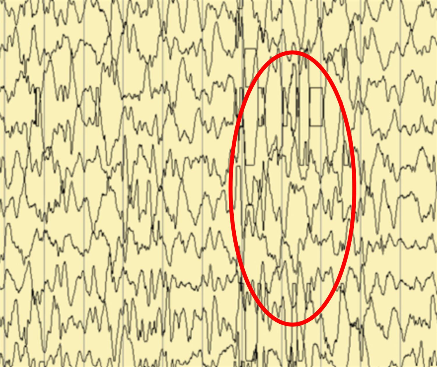 This patient who presents with infantile spasms, developmental regression, and hypsarrhythmia on video-EEG most likely has West syndrome. West syndrome is caused in part by an excess of corticotropin-releasing hormone, which leads to increased neuronal excitability.The pathogenesis of West syndrome is incompletely understood. Infantile spasms are often idiopathic, but may also be secondary to tuberous sclerosis, hypoxic-ischemic encephalopathy, congenital brain malformations, aminoacidopathies, and organic acidopathies. Brain insults may activate a neuroendocrine stress response, which in turn leads to abnormalities of the hypothalamic-pituitary-adrenal axis. Disturbed immune activation may also play a role. Patients will present with infantile spasms, developmental regression, and slowing and multifocal epileptiform discharges known as hypsarrhythmia. Many affected infants are responsive to ACTH therapy, with cessation of spasms and resolution of hypsarrhythmia in many cases.D’Alonzo et al. review the epidemiology, clinical presentation, pathophysiology, and treatment of West syndrome. They discuss how patients will present with the classic symptoms of spasms and regression. They recommend early diagnosis of this syndrome so that patients can be treated appropriately.Figure/Illustration A is an EEG demonstrating a chaotic pattern of slowing and multifocal epileptiform charges (red circle). This finding of hypsarrhythmia is classically seen in West syndrome.Incorrect Answers:Answer 2: Abnormalities in T-type calcium channels may contribute to absence seizures. Absence seizures are generalized seizures that involve brief, sudden lapses of consciousness and are more common in children. This child’s developmental regression, infantile spasms, and EEG findings are more consistent with West syndrome.Answer 3: Anti-N-methyl-D-aspartate (NMDA) receptor antibodies may cause anti-NMDA encephalitis. Anti-NMDA encephalitis presents with seizures, psychiatric manifestations, and decreased level of consciousness.Answer 4: Decreased gamma-aminobutyric acid (GABA) levels were once theorized to be the basis of epilepsy syndromes. This theory is less accepted today. Moreover, West syndrome is likely not mediated by disturbances in GABA. Nonetheless, vigabatrin, which in part works by inhibiting GABA metabolism, is an effective medication for patients with West syndrome.Answer 5: Vitamin B6 deficiency has not been documented in West syndrome. Some studies have suggested vitamin B6 may be of some benefit in the treatment of infantile spasms; however, there is no evidence that response rates to B6 are different from the spontaneous remission rates predicted from natural history data. Therefore, the pathophysiology of West syndrome is more likely CRH-excess mediated rather than due to a deficiency of vitamin B6.Bullet Summary:West syndrome, which may be caused by CRH excess, presents with hypsarrhythmia, developmental regression, and infantile spasms.